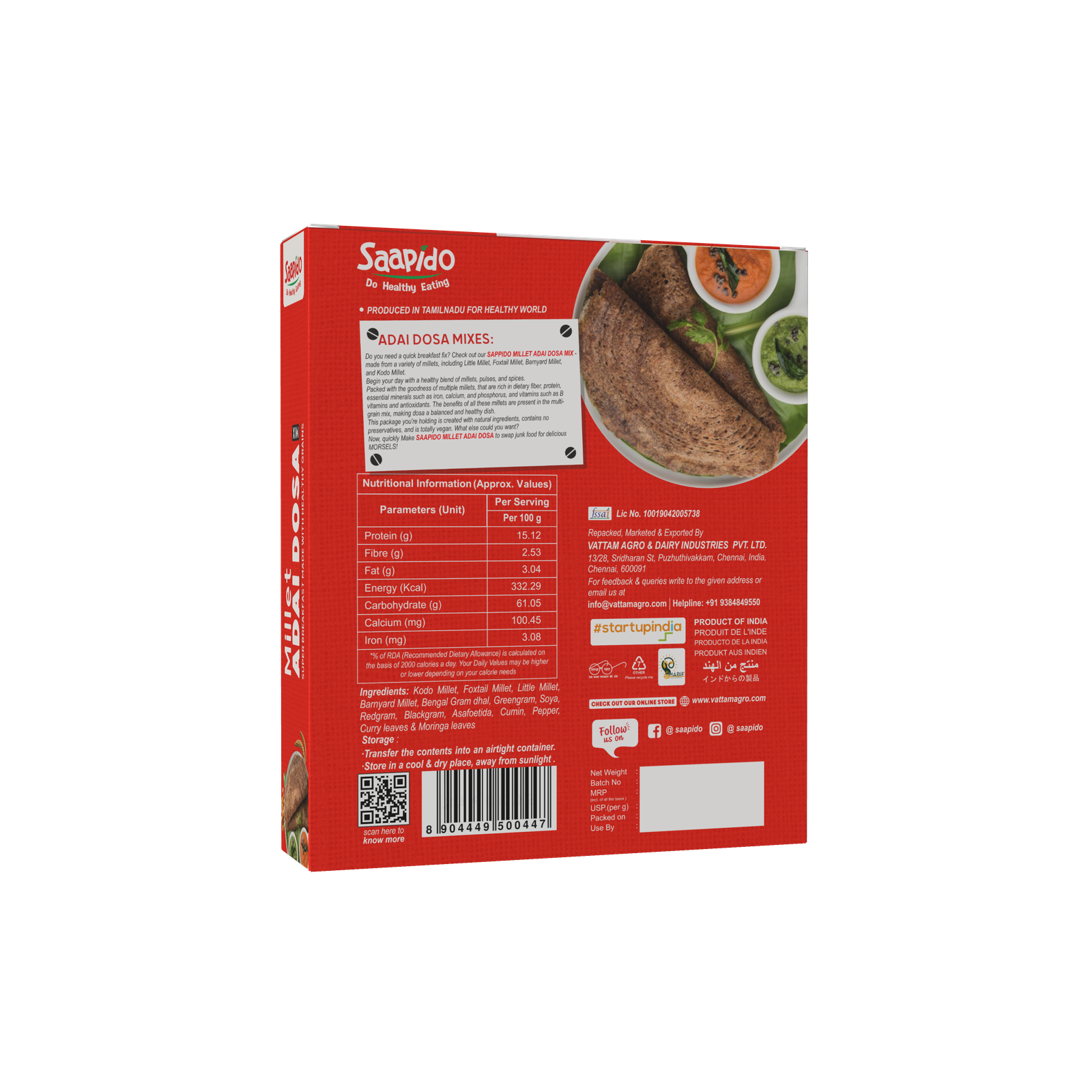 SAAPIDO Barnyard Millet Dosa Batter offers a quick and easy way to prepare delicious dosas. Made with barnyard millet, urad dal, poha, salt, and methi, this batter is savory and convenient.