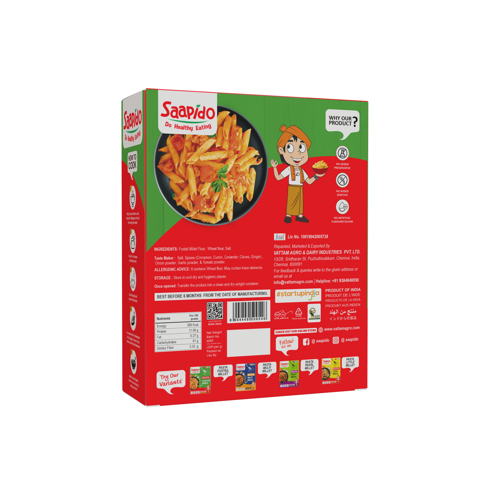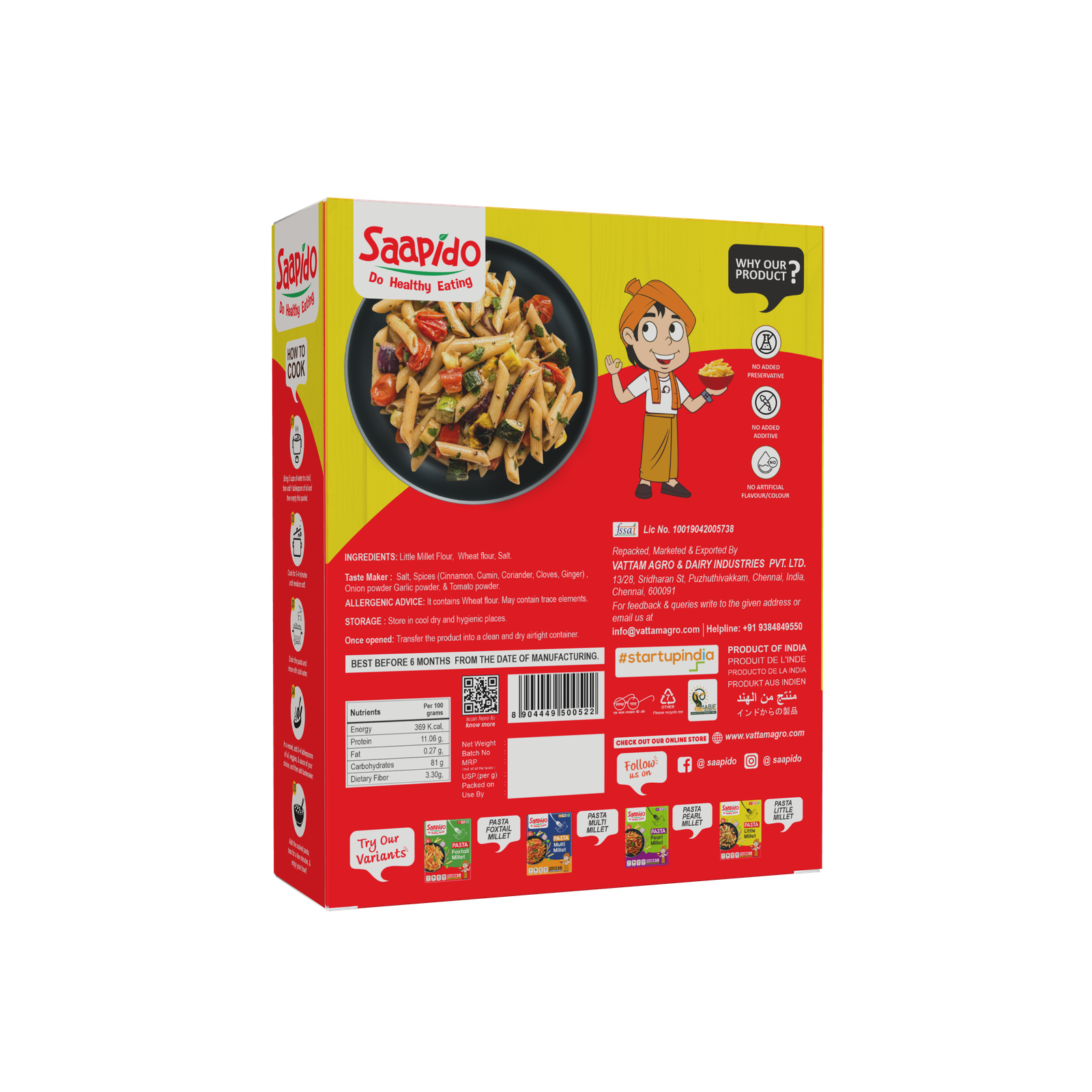 Everyone loves pasta, but taste doesn't have to come at the cost of health. That's why SAAPIDO offers Little Millet Pasta. Little Millet, one of the small millets, is a low glycemic index food. It contains slow-digesting carbs and dietary fiber, which take longer for glucose to enter the bloodstream, helping to control blood sugar levels. We prioritize the use of natural ingredients, ensuring that you enjoy a wholesome and nourishing pasta experience without any artificial additives or preservatives.