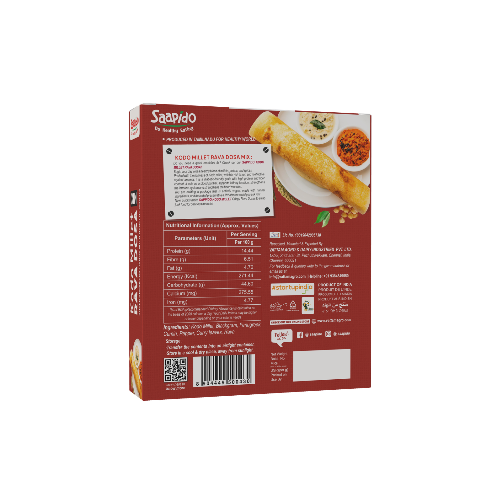 This pack of SAAPIDO Kodo Millet Rava Dosa Mix is immensely popular for its freshness and taste. Made from the finest blend of nutritious kodo millets, this mix not only creates delightful dosas but also is incredibly easy to cook instantly. You can also use this mix to make hot and spongy idlis in minutes, delighting your family.