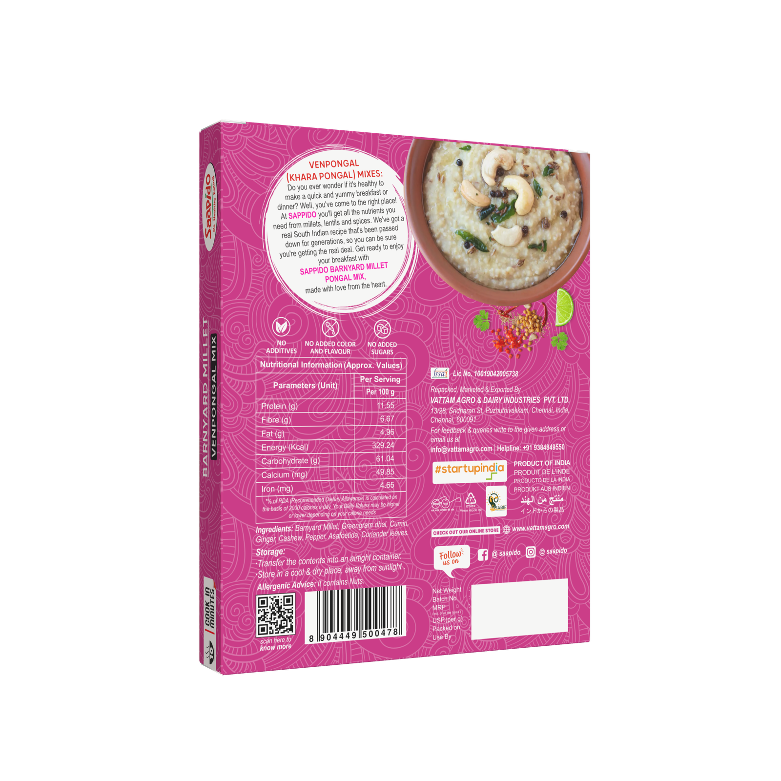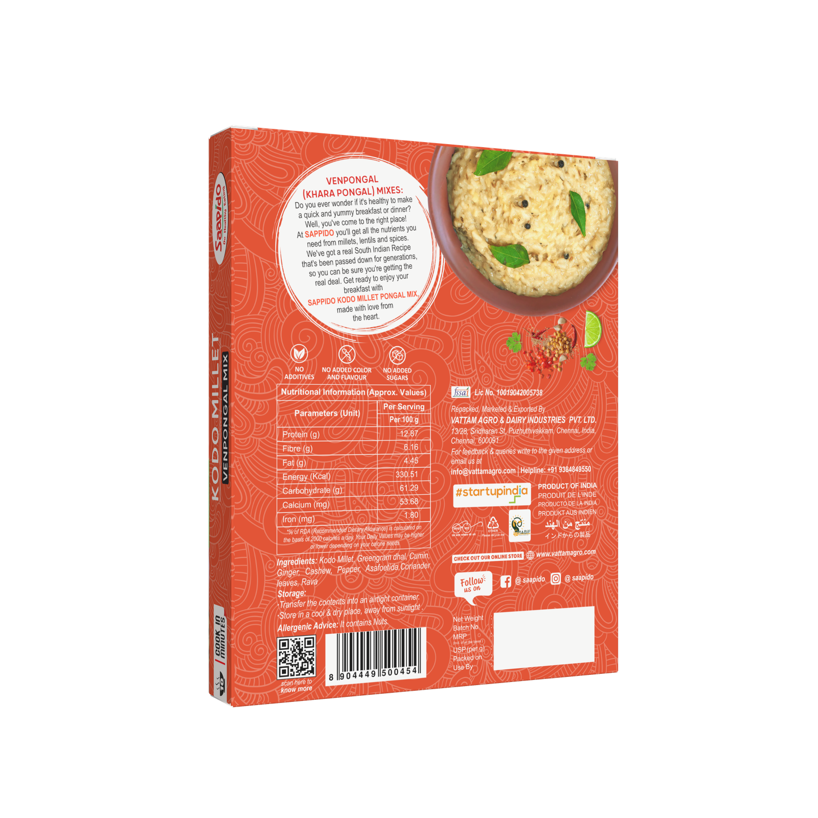 Savor the healthy and delicious Kodo Millet Ven Pongal Mix, a savory dish suitable for any meal. SAAPIDO's mix offers a quick and flavorful preparation, ideal for breakfast, lunch, or dinner. Indulge in this goodness-packed porridge and savor its delightful taste.