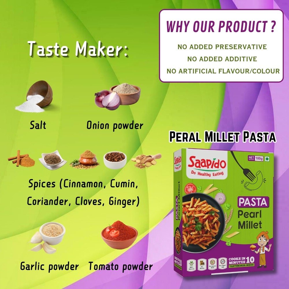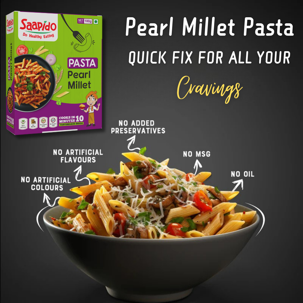 SAAPIDO Pearl Millet Pasta offers a digestible and healthy option to satisfy your hunger. Made with natural ingredients and free from trans fat, preservatives, artificial colors, or flavors, it's a wholesome choice.